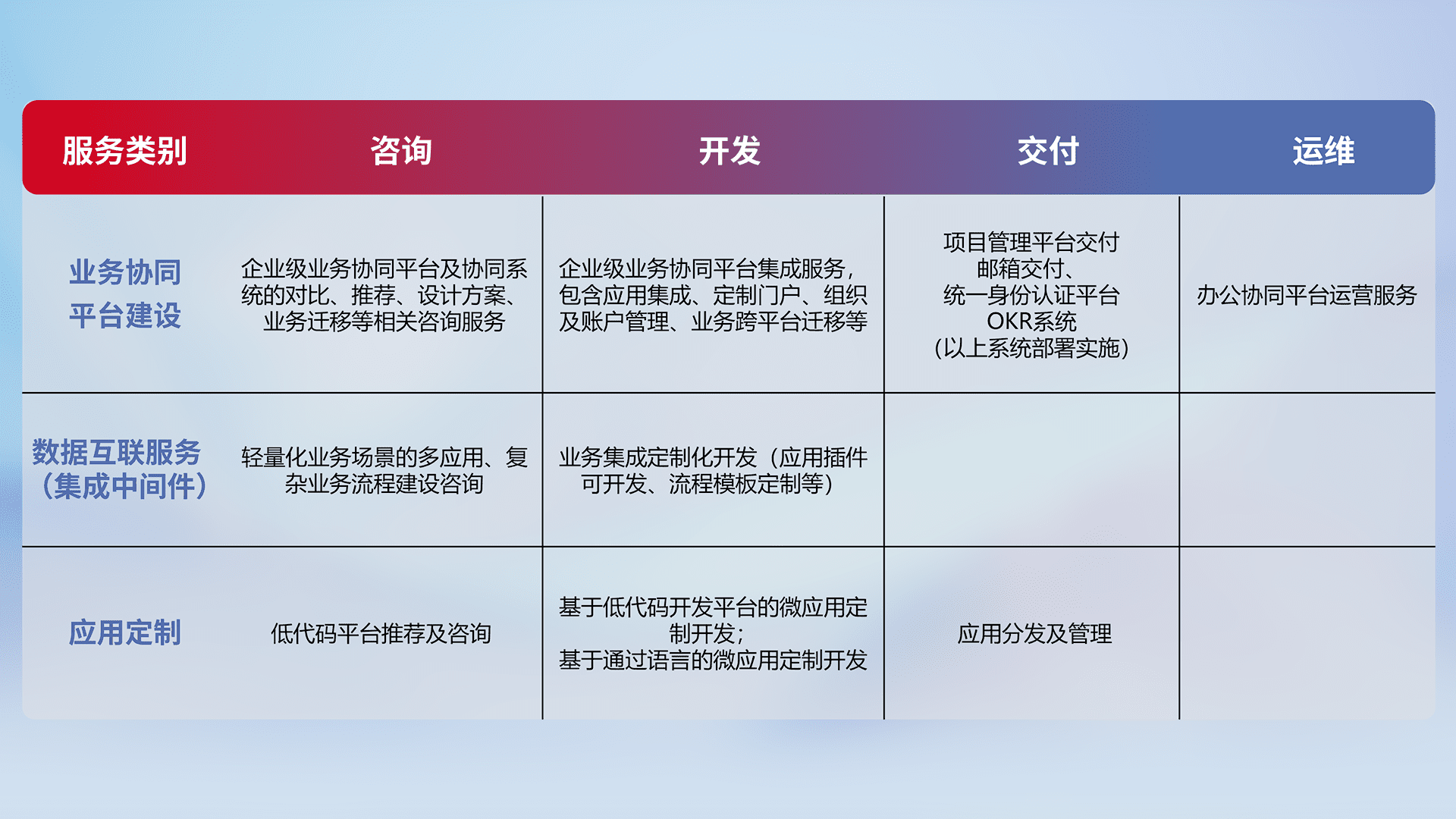 针对钉钉、、、企微、、、、IDaas等平台级产品提供产品的规划、、、方案、、、交付、、、定制化开发等服务,,实现如统一协同办公、、智能客户服务、、、、混合会议管理、、、智能数据查询、、、、等业务场景,,,实现数字化转型。。。